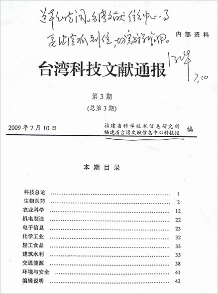 陳樺副省長對(duì)《臺(tái)灣科技文獻(xiàn)通報(bào)》作出批示