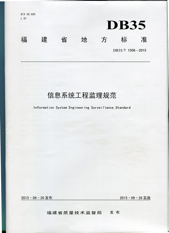 由福建省經(jīng)濟信息中心、福建省科技信息所(福建省計算技術應用研究所)聯(lián)合起草的福建省地方標準《信息系統(tǒng)工程監(jiān)理規(guī)范》(DB35/T 1508—2015)經(jīng)福建省質(zhì)量技術監(jiān)督局批準,于2015年6月26日發(fā)布,并于2015年9月26日實施。