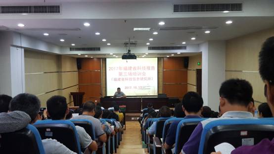 根據(jù)《福建省科技報告制度建設工作方案》要求,2017年省科技廳確定繼續(xù)在省屬公益類科研院所專項項目開展科技報告推廣和培訓工作。為此,省科技報告管理中心在省科技廳發(fā)展計劃處的指導和各協(xié)辦單位的支持下,制訂了周密的培訓工作計劃,于10月11—19日,先后在省農業(yè)科學院、省水產研究所和省信息所舉辦了6場科技報告培訓會。