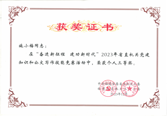 近日,由省委省直機(jī)關(guān)工委主辦、省直機(jī)關(guān)工會(huì)工委承辦的“奮進(jìn)新征程 建功新時(shí)代”2023年省直機(jī)關(guān)黨建知識(shí)和公文寫(xiě)作技能競(jìng)賽公布獲獎(jiǎng)名單。比賽從多個(gè)維度對(duì)黨員干部職工進(jìn)行檢驗(yàn),我所青年干部職工施小梅同志憑借認(rèn)真努力的拼勁,和扎實(shí)的文字功底,在參賽的85個(gè)省直單位350余人中脫穎而出,榮獲個(gè)人三等獎(jiǎng)。